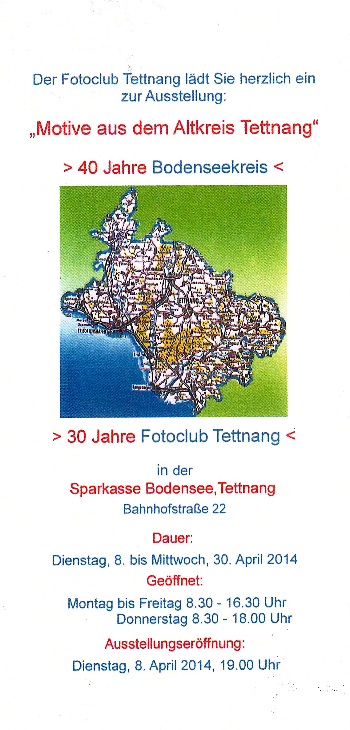 Anlässlich des 30-jährigen Bestehens lädt der Fotoclub Tettnang zu einer Ausstellung in der Sparkasse Tettnang vom 8. bis 30. April 2014 zum Thema „Motive aus dem Altkreis Tettnang“ ein. (Um den Flyer anzuschauen, den Betragstitel anklicken)