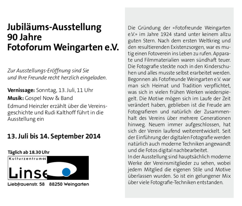 Das Fotoforum Weingarten e.V. lädt zu ihrer Jubiläumsausstellung ein.