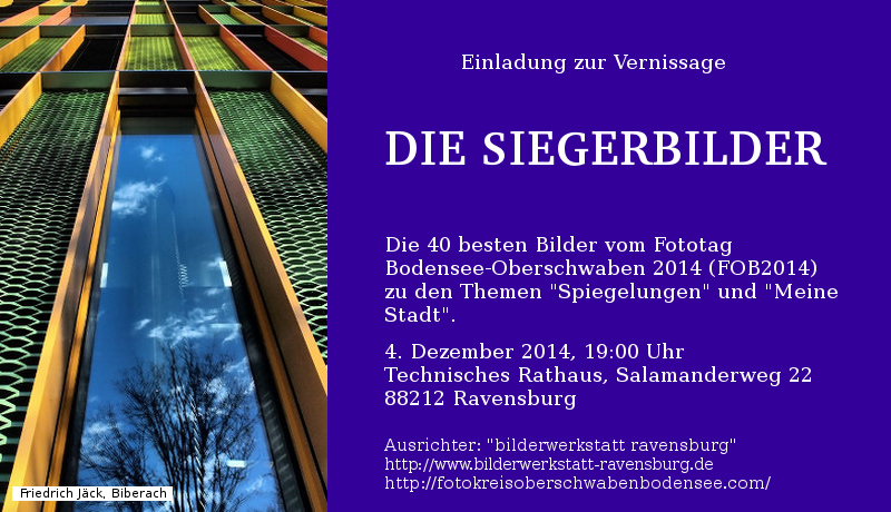 Eine Ausstellung der Siegerbilder des diesjährigen FOB-Wettbewerbs wird ab dem 4. Dezember 2014 im neuen Technischen Rathaus der Stadt Ravensburg zu sehen sein. Die Vernissage findet am 4. Dezember 2014 ab 19.00 Uhr im Eingangsbereich des neuen Technischen Rathauses im Salamanderweg 22, 88212 Ravensburg statt. Die Ausstellung wird von Herrn Bastin, Leiter des Technischen Rathauses, eröffnet und von der Musikschule Ravensburg musikalisch umrahmt. Wir freuen uns auf eine gelungene Ausstellung! Einladung Vernissage FOB Ausstellung TR RavensburgAnfahrtsplan Technisches Rathaus Ravensburg technisches-rathaus-ravensburg