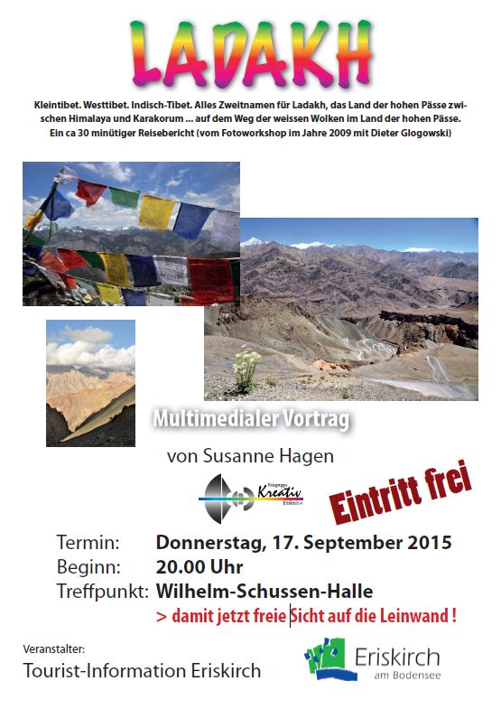 Multimedialer Vortrag in Eriskirch bilderwerkstattravensburg / September 15, 2015 Susanne Hagen vom Fotoclub Kreativ hält am 17.09. einen Vortrag in Eriskirch über Ladakh. Einzelheiten entnehmen Sie bitte dem Plakat. Teilen mit: Auf X teilen (Wird in neuem Fenster geöffnet) X Auf Facebook teilen (Wird in neuem Fenster geöffnet) Facebook Gefällt mir Wird geladen …