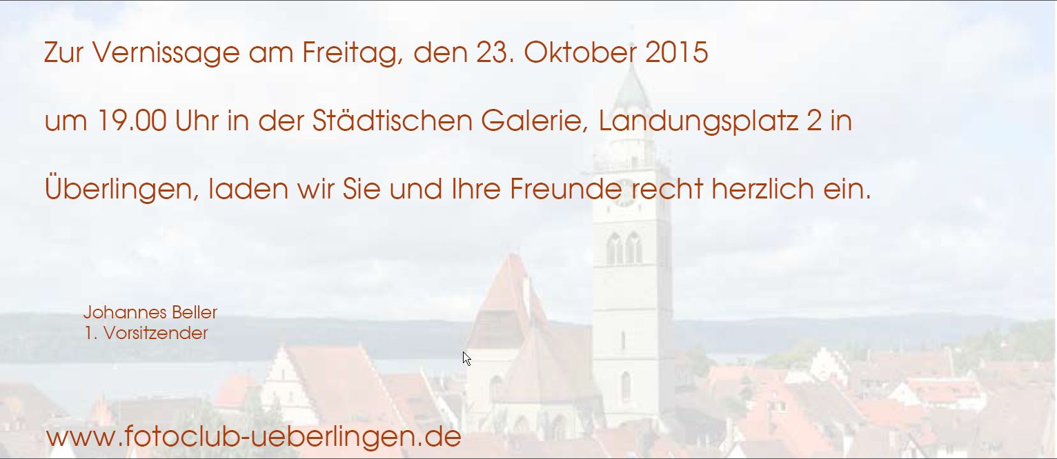 Ausstellung in Überlingen bilderwerkstattravensburg / Oktober 4, 2015 Der Fotoclub Überlingen lädt alle Fotofreunde und -freundinnen zur Vernissage bzw. Ausstellung des Fotoclubs herzlich ein. Wann und wo: 23. Oktober 2015 um 19.00 Uhr in der Städtischen Galerie, Landungsplatz 2 in Überlingen Die Ausstellung ist bis zum 15. November 2015 zu sehen. Teilen mit: Auf X teilen (Wird in neuem Fenster geöffnet) X Auf Facebook teilen (Wird in neuem Fenster geöffnet) Facebook Gefällt mir Wird geladen …