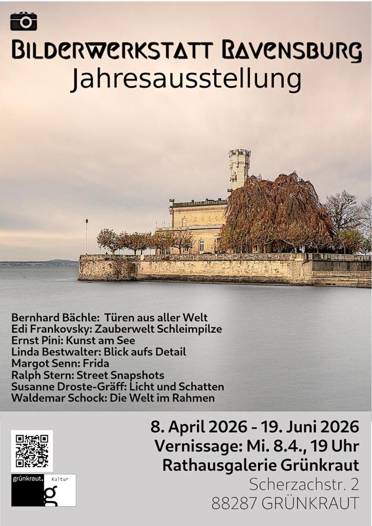 Die Bilderwerkstatt Ravensburg stellt wieder im Rathaus in Grünkraut aus. Die Mitglieder zeigen individuelle Serien zu verschiedenen Themen. Die Vernissage mit musikalischer Begleitung findet am Mittwoch, 8. April um 19.00 Uhr statt. Alle Interessenten sind herzlich eingeladen.
